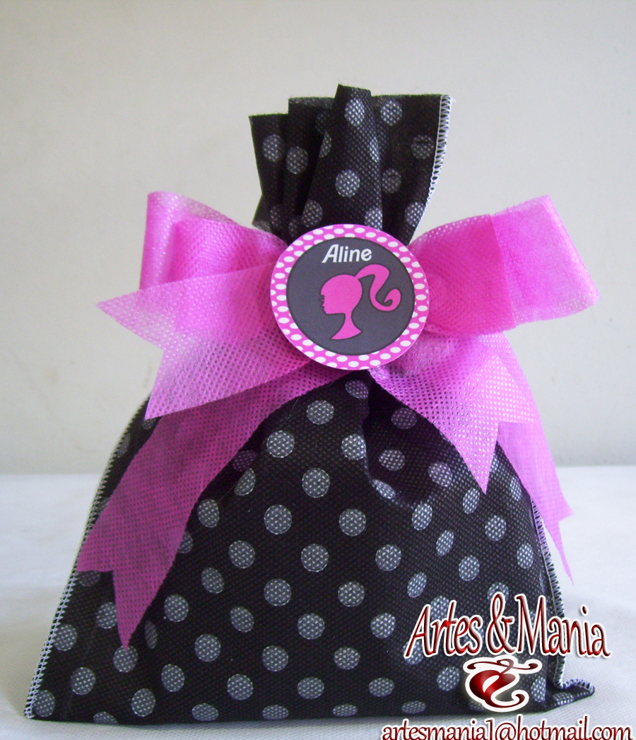 Sacola de tnt estampado poá branco e preto com laço duplo e tag da Barbie.